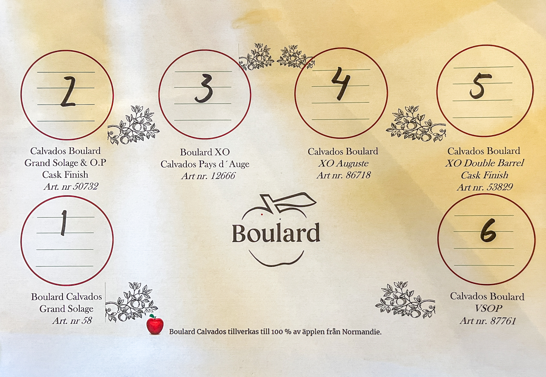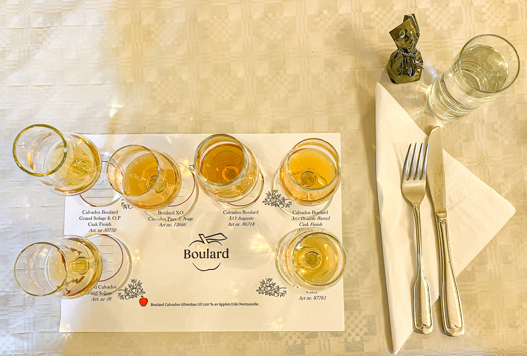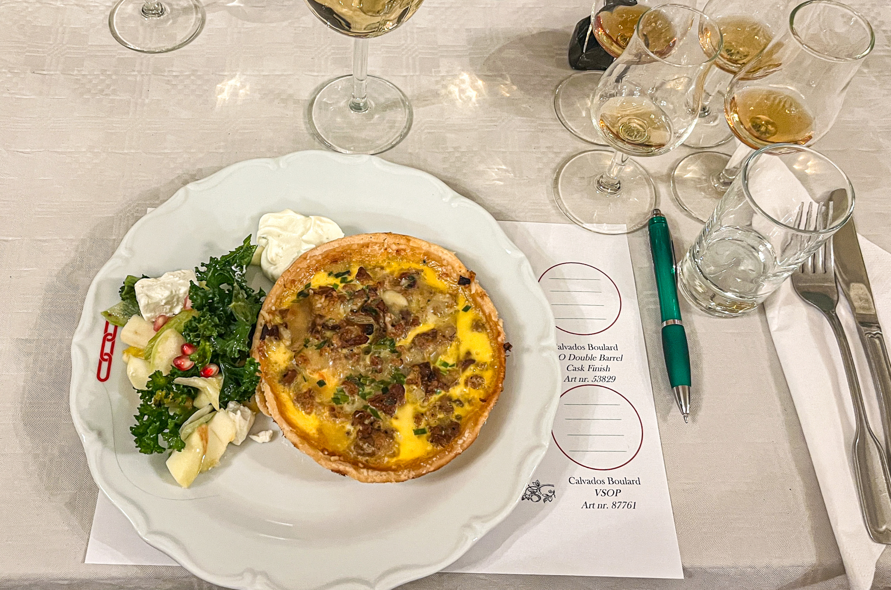 Under kvällen fick vi prova 6 sorters calvados + en specialsort som de bjöd på som var speciellt framtagen till deras 200-årsjubileum. Thomas föreläste om de olika calvados-sorterna och pratade om tillverkning och lite om Boulards historia. Efter provningen åt vi en kantarell- och köttfärspaj från Kockduon.