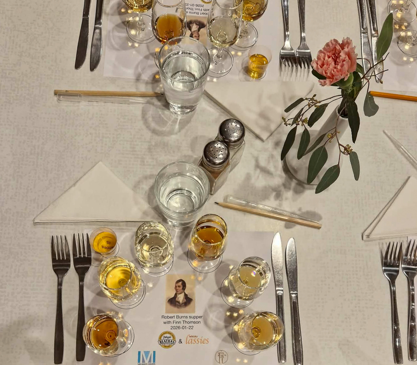 Därefter avnjöt vi en Robert Burns supper. Det var kött eller fisk beroende på personligt val. Nattbakad karré med sparris, whiskygräddsås och potatisgratäng fick de som valde kött. Fiskrätten bestod av lax med  sandefjordsås och ostgratinerad tomat.