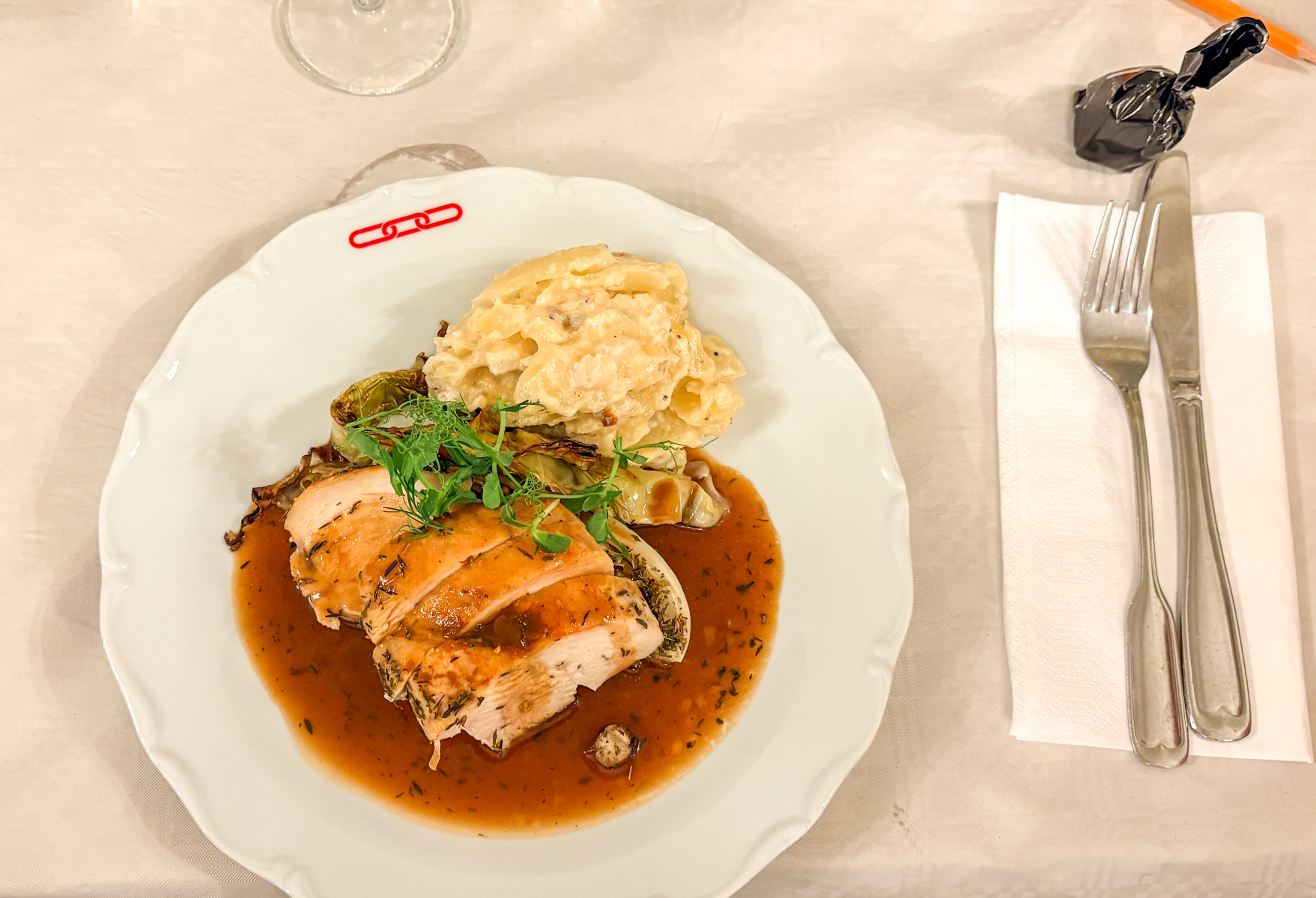 Efter provningen åt vi grillad majskycklingfilé serverad med potatisgratäng, ugnsbakad spetskål & skysås.